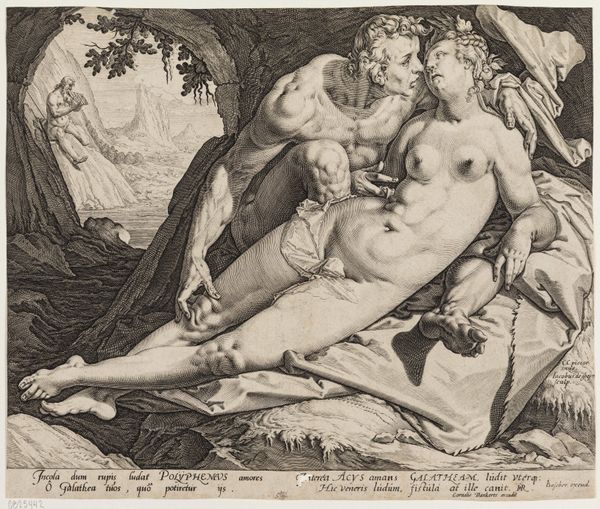 Curator: This engraving, dating from 1588-1591, is entitled "Mars og Venus" and was created by Jacob Matham. The print captures a tender embrace. What stands out to you? Editor: Immediately, I notice how everything seems built on the same limited, perhaps even salvaged materials. From the line quality to the depiction of drapery, it’s like a demonstration of the constraints placed upon production and reception in its moment. There's a roughness there, intentional or not, that complicates any straightforward reading of ideal beauty. Curator: Absolutely. This isn't about surface beauty; it's loaded with symbolism. Look at the figures: Mars, god of war, and Venus, goddess of love, caught in an intimate moment, subverting their traditionally separate spheres of influence. The composition emphasizes allegory through mythological figures, their embrace representing peace and harmony achieved through love. Editor: Yet the texture fights the easy reading you suggest! The engraving process itself adds a layer. Every line is consciously made, revealing labour. Consider how that affects our relationship to themes of eroticism or history. We see not just the narrative but the material effort put forth, as if witnessing labor become visible and valued. Curator: And there is Cupid in the foreground, playfully seizing Mars' helmet, underscoring love's triumph over war, which links the moment directly to a classical cultural memory of conflict tempered by affection. This embodies Mannerism’s stylistic flair through elegant poses. Editor: Precisely, the materials push and pull against any simple interpretation. The act of creating this engraving, the material conditions behind it all - are vital aspects to recognize. We cannot truly extract its emotional or even cultural meanings, from such clear labor! Curator: An insightful point, indeed. The enduring visual power lies within the tensions of symbols. The union of love and conflict embodied through elegant lines and cultural understanding provides multiple interpretative layers. Editor: It serves as a stark reminder that, no matter how lofty the theme, the artwork’s presence, its material “being,” influences the artwork in all of us. A constant interplay between ideas and lived processes shaped and determined art's potential.