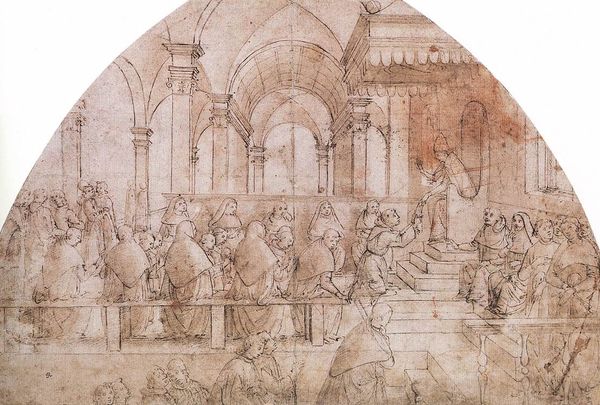 Editor: This drawing by Jan van der Straet, dating from 1523 to 1605, is entitled "Drawing for a Tapestry with the Story of Ulysses and Diomedes." It's ink on paper, currently held at the SMK in Copenhagen. The muted sepia tones and the somewhat frantic line work give the drawing a busy, almost chaotic feel. What do you see when you look at this piece? Curator: I observe a conscious manipulation of form intended to communicate meaning. The artist's lines delineate figures within distinct visual registers, creating a sophisticated visual hierarchy. Note the ornamental border. Editor: It does have an interesting decorative quality! Curator: Indeed, that border’s elaborate structure visually contrasts with the central narrative panels, establishing two levels of engagement for the viewer. The juxtaposition suggests the relationship between artifice and event, or frame and content. The composition as a whole appears designed for dissemination. What is your take on its construction? Editor: Well, that wasn't what I was initially seeing. I was getting more of a sense of, the frantic movements, and a dynamic almost overflowing scene, but I'm beginning to appreciate the levels on which the tapestry interacts! Curator: Exactly. The artist utilizes pictorial space and surface contrast to reinforce intellectual readings of narrative themes, so that the design ultimately encourages a multifaceted and perhaps conflicted viewing experience. The semiotic richness encourages diverse interpretations based upon art appreciation itself. Editor: Thank you, it helps reframe my entire perception of the artwork's narrative! Curator: Indeed. That, after all, is the beautiful thing about form; it always finds function in unexpected ways.
