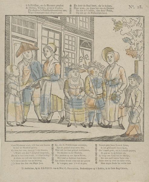 J. Robyn created this print, titled 'T is Pinkster, en de bloemen praalen / in hoven, velden, groene daalen' at an unknown date using etching. The composition immediately draws us into a street scene populated with figures. Lines define the architectural facade and the contours of the people, while sparse use of hatching creates a sense of depth and form. The print's structure is both a social commentary and a semiotic puzzle. The artist uses clothing and accessories to signify social roles and economic status within the community. The figures are rendered with a deliberate flatness, which suggests a challenge to traditional perspective and representation. The use of text around the image can be viewed as a structural device, adding another layer of meaning. It invites us to consider how visual and textual elements intersect to create cultural narratives. Robyn seems to destabilize fixed meanings and engage with new ways of thinking about representation. This etching functions not just as a visual record but as part of a larger cultural discourse.