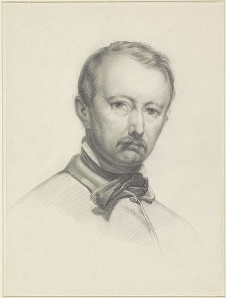 Curator: I find myself immediately drawn into the eyes of this military portrait. The subject conveys an immense amount of reserved strength, doesn't he? Editor: Definitely. And looking at this work on toned paper at the Städel Museum, made with a light pencil work, my initial feeling is intimacy and perhaps vulnerability; a kind of access we usually don’t get with military figures. What do you read into the iconography? Curator: Military uniforms have historically been worn not just for identification but also for projecting authority. A symbol that suggests order, discipline, and national allegiance, almost invariably referencing military honor and duty, regardless of a soldier’s individual circumstances. Editor: Yes, but this one feels quite informal. And I see more than that: the method of the artist Otto Scholderer in sketching a man in uniform also points towards the significance of art schools in 19th-century Europe, offering military portraiture as an excellent subject of study due to its structured form and historical symbolism. Curator: A compelling observation, given that the very light and loose handling emphasizes humanism in the act of looking! It could easily be dismissed as a study; the precision lies primarily in his face, a face seemingly stripped bare, in spite of its proud moustache. Editor: Precisely! The emphasis shifts to the individual—away from institutional or state power. I am struck by the lack of flourish, in favor of direct, unadorned observation of line, technique, and tonal values achieved through layering of the pencil work. We understand the craft here. Curator: And even the visible corrections invite consideration. Consider what this face would mean to him: he might have looked into the very eyes of battles won and lives lost! Editor: Ultimately, it's this sketch's rough quality, this immediate presence, that brings him closer to us as an individual and allows us a glimpse into another man's soul in the time that's past. Curator: A powerful, quiet moment. Editor: I agree, and seeing its construction reveals a much more humane message to me.