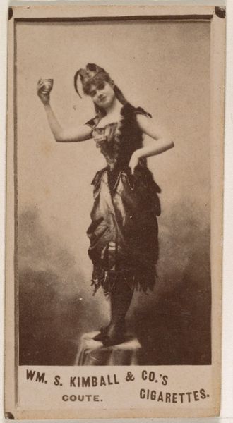 Curator: Let’s discuss “Mlle. Vivian, Paris,” a photogravure print created between 1886 and 1890 by Goodwin & Company as part of a series for Old Judge Cigarettes. My immediate thought goes to its surprising intimacy, given its commercial origins. There's a boldness, an almost defiant gaze. Editor: The materiality speaks to an interesting tension: High-art process meeting low-art purpose. The etching creates a fine texture but here it's advertising tobacco. We should talk about how Goodwin & Company created a collectible within mass-produced goods. Curator: I'm drawn to her costume. The exoticized garb references Orientalist tropes common at the time. Consider the cultural impact this imagery had; not just entertainment, but a kind of psychological commodification of "the other." Editor: Right. Mass-produced image meeting specific consumer. So, who was Mlle. Vivian? And were the other figures in this N171 series also photographed by Goodwin & Company in their New York studio, or perhaps the process involved a traveling set, exotic props carted from place to place. It speaks to the labor required. Curator: Indeed! I notice also her posture— the arched back, slightly tilted head—suggest an assertive feminine agency, defying the patriarchal gaze we often see in portrayals of female performers. Her raised arm invites, yet simultaneously blocks access. A loaded image to be selling cigarettes with... Editor: Exactly. Consumption at so many levels here. She's consuming our gaze. We're consuming this photograph on a tobacco product. The labor is obscured in all that too. One print pulled by an anonymous hand is infinitely reproduced. Curator: I hadn't quite framed it that way. I leave our listeners with the enduring enigma of "Mlle. Vivian, Paris". A single ephemeral object revealing deeper layers of psychological intrigue and historical representation. Editor: A reminder that the things we handle, especially mass produced things, carry more history of making, distribution, and, yes, even performance than meets the eye.