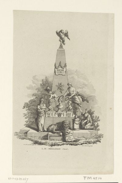 Isaac Weissenbruch made this print of a monument in the Netherlands, sometime around 1856. It depicts a statue framed by vegetation and the dates 1830, 1831, and 1856. The monument itself commemorates events that took place between 1830 and 1831, when Belgium separated from the Netherlands. Weissenbruch created this print in 1856, the year the monument was erected in the city of Haarlem, where it still stands today. Prints like this one helped circulate images of the monument, shaping public memory of the war. The image speaks to the complex relationship between art, national identity, and institutional power. Knowing the date and location of the monument helps us understand the print as more than just an image, but as a document reflecting Dutch history and collective memory. Further research into Dutch nationalism and war memorials in the mid-19th century would offer more insights.