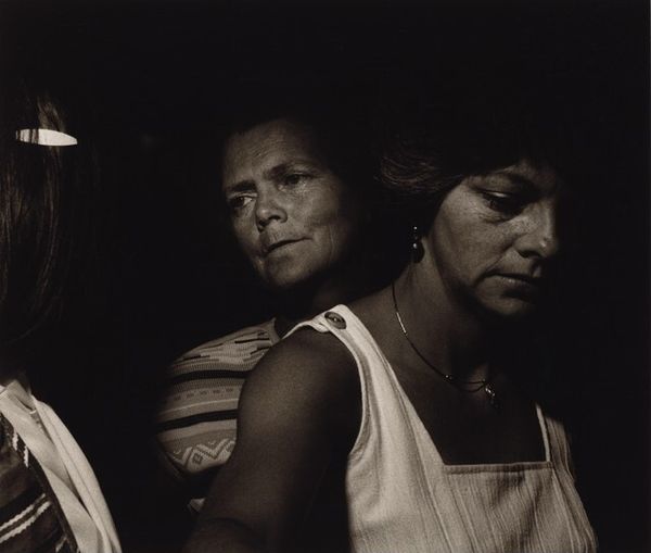 Editor: So this is Larry Fink's "Second Hungarian Ball, New York City," from 1978. It’s a black and white photograph. There's such an interesting mix of expressions—one woman looks almost fearful, while the other is smiling. It's definitely got my attention. What stands out to you in this piece? Curator: What immediately strikes me is Fink's focus on capturing candid moments within a specific social stratum. Balls like these are carefully constructed displays of wealth and belonging. Considering Fink's larger body of work, it seems that he seeks to expose the subtle tensions beneath the surface of these events. Do you get a sense of unease, perhaps? Editor: A bit, yes! Especially from the woman on the left. It makes me wonder what the story is behind the image. Was Fink trying to critique the wealthy elite or just document a particular subculture? Curator: That's the question, isn’t it? Is he offering commentary or simply observing? Remember that Fink often photographed marginalized communities, and this work forces us to question how his approach shifts when documenting privileged spaces. Who gets to be seen, and how, is a recurring question in his work. The framing, the slightly off-kilter angles... all suggest a desire to disrupt the expected, the polished facade. What does it mean to 'restore' or preserve historical photos in today's world, or even classify this picture as celebrity portrait when that description feels very unnatural? Editor: That's a really good point. It makes me think about how art can reflect societal power dynamics, even when seemingly just capturing a party. Thanks for the insight! Curator: Absolutely. It's fascinating how a single photograph can open up so many avenues for understanding social and political landscapes.