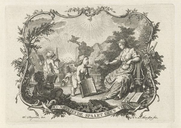 Curator: Look at this striking print, "Embleem met Vrijheid en Mars," made between 1724 and 1769 by Noach van der Meer I, here at the Rijksmuseum. What's your initial read? Editor: It feels...tense. A staged allegory. Look at the way every element is so meticulously delineated with these tiny marks. You can almost feel the copperplate's weight in the impression. Curator: Indeed. Van der Meer created this engraving to represent Freedom and Mars—the god of war—in symbolic union. See how Freedom, on the left, extends her hand to Mars? Above them, the all-seeing eye... loaded with symbolic implications. Editor: It's incredible to me that all of this intricate detail, all of this allegory, comes from the physical act of etching. What tools were involved? What sort of acid was employed? Look closely, you can almost feel the craftsman leaning over the plate... Curator: And beneath, a Latin inscription: "Cuncta haec tutabitur unus," meaning "One will protect all this." The single protector reinforces that promise, or perhaps a warning. Editor: But is it truly protection? Or control? Consider the economic system which this engraving was created. Who commissioned it? Whose interests does it really represent? The visual language is opulent, yet grounded in physical labour. Curator: That’s a fascinating way to put it. The figures, classical in style, embody specific ideas. Mars in his Roman armor, a shield nearby, freedom holding the staff. A history painting within a symbol, carefully packaged with the baroque botanical decorations framing it all. Editor: The act of engraving and printing... reproducing imagery and therefore ideas for broader consumption raises compelling questions about craft, social structures, and disseminating ideologies. Curator: Right. Images serve functions within the material world and leave their symbolic legacy too. Editor: Precisely. It makes you consider just how complex the seemingly simple act of creating images actually is.