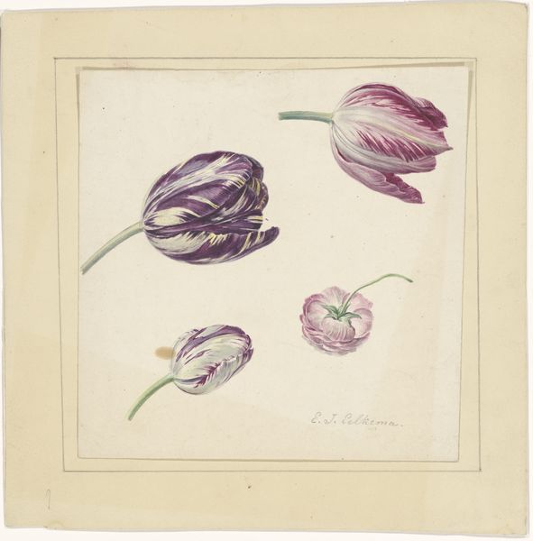 Eelke Jelles Eelkema rendered this small watercolor drawing, titled ‘Ixia’, sometime in the first half of the nineteenth century. The composition features three flowering stalks against a light background, arranged to emphasize their delicate forms and colors. The Ixia flowers are depicted with a focus on line and color, showcasing their slender stems and subtly colored petals. Eelkema’s attention to detail transforms a botanical study into an exercise in composition. The flowers’ arrangement plays with asymmetry and balance, drawing the eye across the picture plane. The translucence of the watercolor medium enhances the ethereal quality of the flowers, making them seem almost weightless. The artwork embodies the period's interest in natural history and its intersection with artistic expression. The careful rendering of the Ixia flowers suggests a broader engagement with classification, representation, and the visual language of science. This seemingly simple botanical study opens up questions about how we observe, document, and aesthetically interpret the natural world.