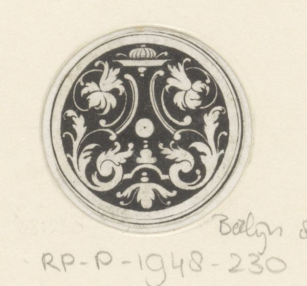 This tiny design, titled "Cirkelvulling met bladmotieven", was made by Pierre Bourdon around 1700, likely as a proposal for metalwork. The drawing is executed with crisp lines, using ink on paper to create a symmetrical pattern of stylized leaves and ornaments, set against a dark background. The precision of the work suggests it was intended for reproduction, perhaps as a template for chasing or engraving on metal. Bourdon's design reflects the period's taste for detailed, organic forms, but it also speaks to a wider shift in the decorative arts. Designs like this fuelled increased production and consumption. The intense labour required to translate this drawing into metal was offset by the fact that once realised, the design could be multiplied almost endlessly. Considering this piece, we can appreciate how the act of design, combined with skilled execution, played a crucial role in shaping early modern material culture.