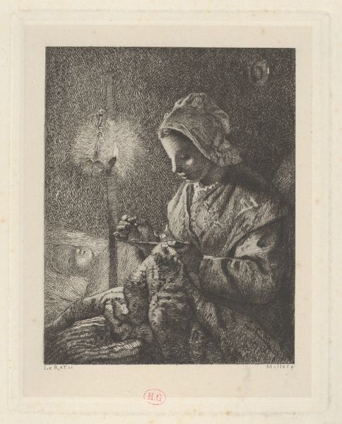 Otto Scholderer's drawing, "Girl with a Fruit Basket," presents a study in contrasts through its delicate linework and composition. Notice how the subject, positioned centrally, is rendered with detailed hatching that defines the contours of her face and clothing. This intricate technique contrasts with the looser strokes that depict the surrounding foliage and the distant house. The composition subtly divides the scene between the structured, almost geometric rendering of the girl and the more organic, free-flowing depiction of nature. Scholderer uses line to create textures and to subtly convey a sense of weight and form, particularly in the fruit basket. Consider how this interplay between structure and fluidity might reflect broader artistic and philosophical concerns of the time, where artists were beginning to explore the boundaries between representation and abstraction. The drawing invites us to contemplate how form and content interact to shape our perception and understanding of the world.