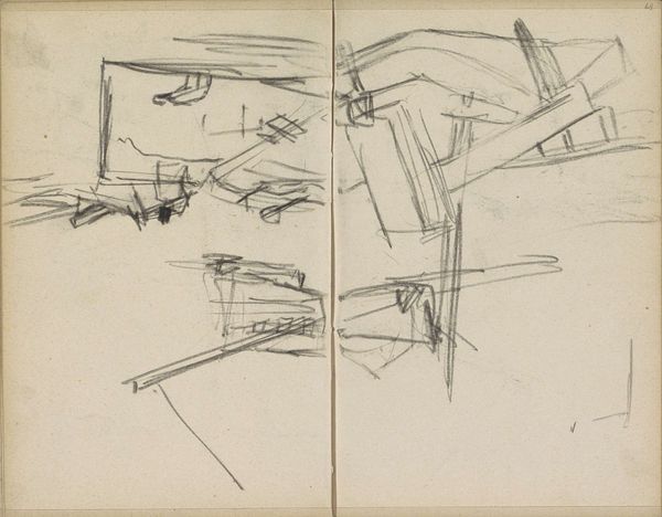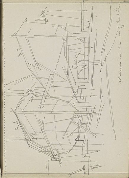 Curator: Looking at this frenetic little drawing, what strikes you first? Editor: Chaos, beautifully rendered. It’s like a diagram of pure urban energy, caught mid-explosion. I find myself wanting to decode it, to trace the movement implied in these layered lines. Curator: Exactly! This ink drawing on paper, titled “Gezicht in Amsterdam” or "View of Amsterdam", comes to us from George Hendrik Breitner, dating from about 1895 to 1898. The work now resides in the Rijksmuseum. For me, it’s raw and unedited—a peek into Breitner's creative process. Editor: Breitner… yes, he had a restlessness, didn't he? The drawing vibrates with it. And I am seeing things! A church spire, perhaps, rising behind scaffolding, and figures suggested by just a few deft strokes. Do you think these rapid lines were meant to serve a symbolic role or merely to capture fleeting visual information? Curator: I suspect it’s both. Breitner was deeply invested in capturing the immediacy of urban life; this sketch certainly documents the changing cityscape of Amsterdam at the time. The verticality, the overlapping horizontal strokes – it almost suggests musical notation to me. Editor: I see the music, but the symbols go deeper. Lines are always about connections, boundaries and direction, and in the modernizing city those vectors cross and create new maps. This sketch feels like he is working out the direction of change itself. Curator: I love that reading. Perhaps the "view" here is not just of Amsterdam's buildings, but a view into the dynamism of a city in transition. What stays with you? Editor: How little he needs to suggest so much. Breitner isn’t trying to give us a picture, but a feeling, a lived moment in a place that is, even then, being continuously rewritten.