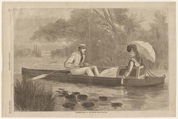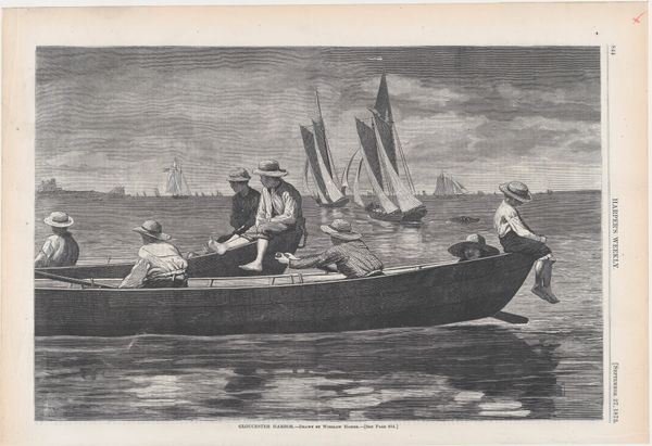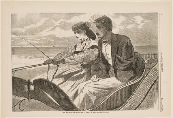 Curator: Winslow Homer created this poignant wood-engraving, “Our Watering Places – The Empty Sleeve at Newport” in 1865. It's currently housed at the Minneapolis Institute of Art. Editor: It strikes me as terribly melancholic, all those subtle lines and tones. A sort of faded photograph brought to life through meticulous rendering. I feel this overwhelming quietness, almost as if a silent story yearns to be told. Curator: The choice of medium significantly influences our experience, doesn't it? Homer's masterful use of wood engraving underscores the socio-political themes of loss and resilience in the aftermath of the Civil War. It captures the quiet, enduring impact of conflict on individual lives and social relations. Editor: I notice the man’s missing sleeve, so matter of fact. The waves rolling calmly behind him... It’s incredibly somber yet strangely hopeful at the same time, wouldn’t you agree? It is so odd - a moment of leisure charged with absence. A complex mix of relaxation and grief? Curator: Precisely! The "empty sleeve" serves as a stark reminder of the physical and emotional wounds inflicted by war. This work intersects questions of disability, masculinity, and societal reintegration of veterans during the Reconstruction era, doesn’t it? The leisure pursuits of the wealthy contrast sharply with realities facing a war-torn nation. Editor: Oh, without a doubt, like looking through a gauzy curtain between realities. All those tiny detailed engravings really intensify the feeling. It's the artist pointing at reality asking us if we noticed that particular thing and demanding an emotional reaction. Curator: Ultimately, this work functions as both a historical document and a powerful critique of the social inequalities of the time. Editor: A delicate balance between what is seen and what’s deliberately unseen! I can now see so much!