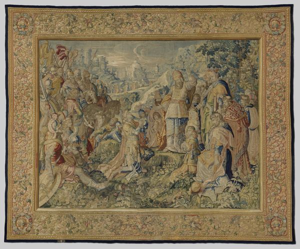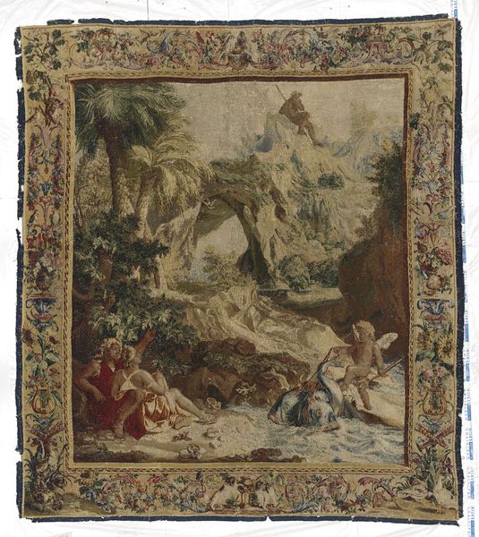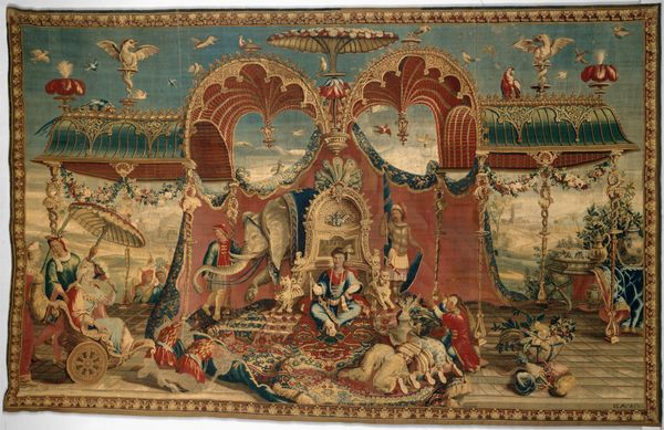 Lodewijk van Schoor created this tapestry, "Abundantia," part of "The Four Continents," using wool and silk, likely around the late 17th century. The scene brims with figures, overflowing cornucopias, and luxurious drapery, set against a backdrop of classical architecture and verdant gardens. The composition is structured to convey abundance and opulence, with each element carefully placed to contribute to the overall sense of lavishness. The artist uses a rich color palette and intricate detail to engage with the baroque aesthetic. This celebration of plenty is not just a visual feast but also a complex encoding of status and power. The tapestry suggests a world where nature and culture combine to create a vision of limitless resources. However, one might also read the overabundance as a potential source of instability, hinting at the transient nature of wealth and the potential for excess to lead to decay. The complex layering of the scene invites an ongoing interpretation of its meanings, prompting us to consider the social and philosophical implications of such displays of wealth.