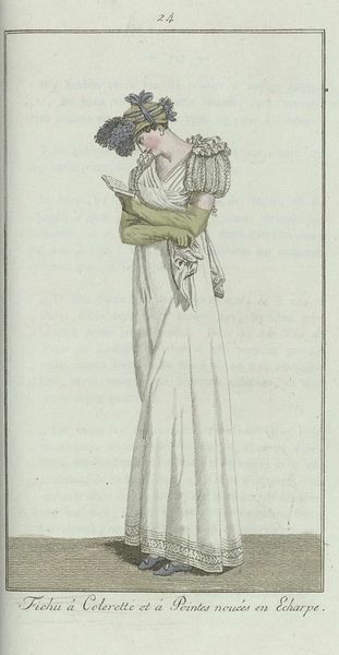 Curator: Welcome. Before us is "Elegantia, of tijdschrift van mode, luxe en smaak voor dames, Juni 1807, No. 14: Chapeau de Paille..." from 1807, housed here at the Rijksmuseum. It's rendered using pen and drawing techniques. Editor: Immediately, the composition strikes me as delicate, almost wistful. The light pencil work gives a sense of transient beauty, perfectly capturing the ephemeral nature of fashion. Curator: Indeed. But consider the material implications. “Chapeau de Paille,” refers to the straw hat. This implies an industry, the craft of weaving, the laborers involved. Were these hats a signifier of wealth, considering the raw materials and craft required? Editor: Precisely. The structure of the artwork speaks to that interplay. The artist emphasizes the textiles, each line meticulously placed to highlight texture, the drape of the shawl, the fall of the dress. Notice also how the minimal color palette isolates specific details, leading our eye to interpret their importance. Curator: And the context, consider. This piece was featured in a fashion magazine. These illustrations weren't just aesthetic; they served a function. Think about the methods of printing, of distribution, the whole engine driving desire for these objects. Who made these objects, under what conditions? Editor: A question that complicates the romanticism we see. I think it embodies that tension—the object as an idealized representation versus the complex web of production, labor, and consumption. Curator: Yes, a lens through which to read this drawing. We are left contemplating its surface appeal, while remaining alert to the socio-economic conditions of its making. Editor: Absolutely. And perhaps to reassess our perception of seemingly innocuous fashion plates. A testament to the era's vision of elegance and social complexity intertwined.