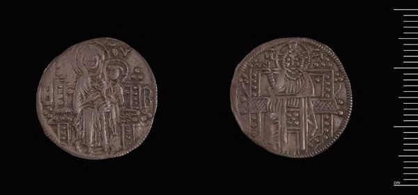 Editor: This is a basilicon, a coin, commissioned by Andronikos II. The material has aged, but you can still see imagery on each side. What symbols stand out to you? Curator: The imagery evokes a direct connection between the earthly ruler and divine authority. Note the Virgin and Child enthroned on one side, a powerful symbol of protection. Editor: And the two figures on the other side? Curator: Ah, those are likely Andronikos II himself, depicted twice to reinforce his power and legitimacy through repetition. Their stylized garb and posture convey imperial dignity, but also perhaps rigidity? Editor: It's interesting how these images function as both symbols of power and historical records. Curator: Indeed. They offer a glimpse into the cultural and psychological landscape of the Byzantine Empire.