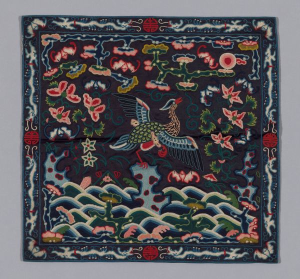 Editor: We’re looking at a ‘Buzi,’ a Court Rank Badge, dating possibly from 1825 to 1911. It’s at the Art Institute of Chicago and it seems to be textile art. The intricacy of the woven dragon against the swirling cloud background is captivating. How do you interpret this piece? Curator: It's a powerful visual statement, isn't it? These badges weren't just ornaments, they were loaded with symbolism. The dragon, of course, is a potent symbol of imperial power and authority in Chinese culture, representing the Emperor. Note how the clouds surrounding it are rendered - what feelings do those details suggest to you? Editor: I guess they represent an ethereal realm, or maybe prosperity. It feels almost like the dragon is ascending, going somewhere important. Curator: Precisely! Clouds in this context often signify good fortune, and aspiration. And look at the wave patterns below, grounding the dragon yet also suggesting its emergence from the waters – perhaps symbolic of the rise in status afforded by the court. Considering it’s a ‘rank’ badge, who might have worn it and what do you think that symbolized to onlookers? Editor: Possibly a high-ranking official. Wearing it would instantly communicate their position and authority, right? It's like a visual shorthand for their place in the social hierarchy. Curator: Exactly. Each detail reinforces the wearer's significance within the imperial system, steeped in history and culture. The cultural memory woven into each thread makes the piece so much more than just decoration. Editor: That’s amazing. It really makes me think about how much more there is to see beyond just the surface of a work of art. Curator: Indeed! Hopefully this inspires you to contemplate cultural memory in more pieces moving forward!
