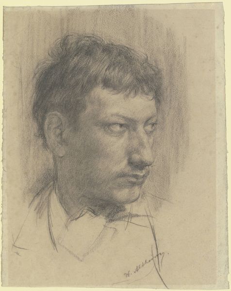 Editor: Here we have Nicolaas van der Waay’s "Self-Portrait," estimated to be from sometime between 1875 and 1900, created using graphite. It strikes me as incredibly intimate, almost as if the artist is peering right into my soul. What catches your eye when you look at this drawing? Curator: Intimate is spot on! I see a man wrestling with his inner self, laid bare through the vulnerable medium of graphite. The scratchy lines, the smudges—it's as if we're witnessing the artist’s thoughts take shape on paper. Makes you wonder what was swirling in his mind as he stared at his reflection, doesn’t it? Editor: Absolutely. There's a sense of melancholy, perhaps even a hint of defiance in his gaze. Is there a particular artistic movement or style that this piece resonates with for you? Curator: Well, it flirts with Realism, that yearning to capture life as it *is*, flaws and all. But it also has this romantic whisper of self-expression. Notice how the background fades into darkness? It throws all the focus onto his face, this single site where all the emotion seems to live. It’s like he's saying, “This is me, take it or leave it.” What do you make of the rather pronounced mustache? Editor: I suppose the mustache can signify sophistication, but also a way to maybe hide emotions, acting as a visual barrier? The way you highlighted the expressive use of line makes me see beyond the literal representation and sense Van der Waay's emotional state. Curator: Precisely. The imperfection is the perfection. It's a lovely reminder that art, like life, is rarely clean and tidy. This little drawing whispers stories, doesn't it? Editor: It really does. I initially saw it as a straightforward portrait, but now it feels like a portal into the artist's mind. Thanks for opening my eyes!