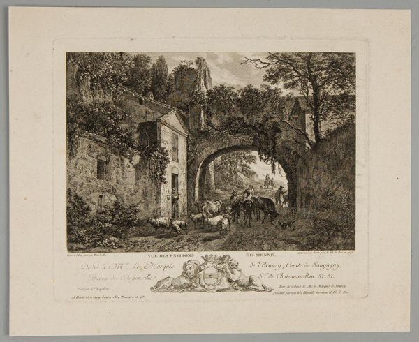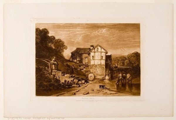 Curator: J.M.W. Turner's etching, titled "Water Mill," presents a serene landscape scene. Editor: The sepia tones create a nostalgic, almost melancholic mood, don't you think? Curator: Note the balanced composition, how Turner uses the mill as a central anchor, juxtaposing the rustic architecture with the natural landscape. Editor: Water, of course, has so many associations – purity, transition, the subconscious. The horses drinking evoke a sense of pastoral harmony, a connection to the land. Curator: Indeed, and the etching technique allows for a remarkable range of textures, defining planes and volumes with precision. Editor: Yes, but also softening the edges. The overall effect is one of tranquility, perhaps hinting at simpler times, a harmony we long for. Curator: I'd say it's a fascinating study in the interplay of light and shadow, a demonstration of formal mastery. Editor: For me, it's a beautiful reminder of nature's enduring power and our connection to it.