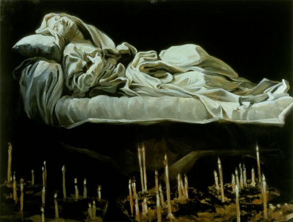 Curator: This painting by Manuel Rodríguez Lozano, created in 1944, is titled "The Holocaust." It's a powerful piece rendered in oil, currently residing at the Museo de Arte Moderno in Mexico City. Editor: Immediately, I'm struck by the haunting pallor of the figures and their supplicating postures. It feels as though I'm witnessing a ritual, or perhaps a desperate plea. Curator: Absolutely. Note the central positioning of the arch, framing empty space, it evokes absence. Consider how Lozano uses that stark, vacant space as a symbol for immeasurable loss, resonating with the profound destruction enacted during the Holocaust. Editor: The elongated figures, reaching, straining...there's an undeniable expressionist influence here, channeling the emotional turmoil. But also the ways those blues and whites evoke iconic representations of the Virgin Mary mourning the dead Christ. I feel as though Lozano is drawing parallels to other devastating histories of suffering and sacrifice. Curator: A very perceptive point! The repeated motif of veiled figures, they symbolize mourning but also signal how grief is often communal and culturally patterned. There is definitely shared visual and iconographic heritage invoked here. It is powerful. Editor: I am curious though... Is Lozano trying to universalize the Holocaust's pain or, potentially, overshadow the specifics of Jewish suffering with a broader sense of grief? It is important to be reflexive about how we view such potent imagery and recognize whose voices, which stories, get represented – and possibly muted – by art. Curator: That’s a valid provocation. As a Mexican artist reflecting on global events, Lozano may have aimed to connect this specific tragedy with shared experiences of colonialism, oppression, and displacement across Latin America. He is trying to process a world trauma that he only can access through a specific visual lens. Editor: The angularity and contorted gestures serve not only as expressionist tropes, but I would even go as far as to interpret this from an intersectional perspective. This work feels inherently like a reflection of intergenerational trauma and calls for an ethical looking and empathetic thinking on behalf of the viewer. Curator: Indeed. By layering symbols of mourning and sacrifice across cultures, Lozano makes "The Holocaust" a lasting symbol of our collective responsibility to remember and act. Editor: It also compels us, even now, to relentlessly question how representation, memory, and social action intertwine when we confront atrocity. It serves as a starting point to do that important intersectional, critical thinking.