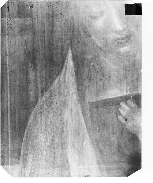 Curator: At the Harvard Art Museums, we have an X-radiograph of a copy of Gilbert Stuart's "Sedwick" portrait. The image gives me a sense of peering into the past. What do you think? Editor: It's ghostly, like a face caught between worlds. It's a portrait, but the X-ray quality gives it a feeling of distance, of unearthing something hidden. Curator: X-rays reveal underdrawings and alterations, whispering stories of the artist's process. Perhaps a symbol of how we seek to understand the layers of a person, both visible and invisible. Editor: And the black square at the top? It's a modern intrusion, a stark reminder of the clinical gaze we bring to even the most human subjects. Curator: Absolutely. It's a potent reminder that we can never fully know the past, only interpret its echoes. Editor: Right, a dialogue between the artist's intention, the sitter's persona, and our own contemporary understanding. Fascinating!