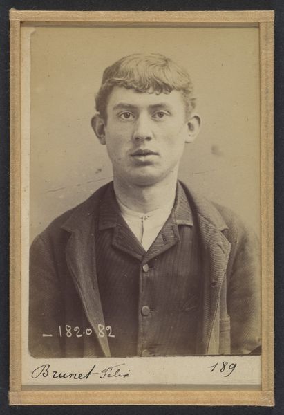 Editor: Here we have a gelatin silver print, a portrait by Alphonse Bertillon, created in 1894. It's titled "Monzon. Lucien, Henri, Baptiste. 18 ans, né à Paris XXe. Couvreur. Anarchiste. 23/3/94." which seems to give the subject’s name and some other identifiers. It has quite an unsettling and clinical feeling to it. What strikes you about it? Curator: The intensity of the gaze, wouldn't you say? The stark presentation, with that detailed inscription beneath, transforms a mere portrait into a potent cultural symbol. It speaks of a very specific time and ideological conflict. Consider, the sitter, a self-declared anarchist… what emotions are evoked by that label, and how might those feelings shift with time and knowledge? Editor: I suppose anarchism would have had a very different connotation then, maybe more frightening. How much can we really read into these symbols and labels? Curator: Symbols gain their power through collective memory and cultural continuity. The label "anarchist," then as now, might conjure feelings of disorder, yet it simultaneously reflects ideals of freedom and autonomy. Bertillon’s portrait freezes a moment where an individual’s identity clashes with societal perception. Is his apparent vulnerability enhanced or undermined by the "anarchist" descriptor? Editor: That makes me think about the power of photography itself. This photograph fixes him in time and assigns him these labels that may not fully represent him. Curator: Precisely. And how the use of photography changed portraiture, transforming it from primarily commemoration to also having these applications in policing. What did you notice about his clothes or lack of artifice, like the missing button on his collar, for instance? Editor: Now that you point that out, I see his attire appears to be intentionally plain, adding a very specific kind of "ordinariness". I learned a lot from this! Curator: And I hope this taught us both something new.