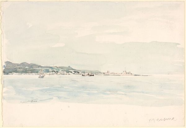 Muirhead Bone created this watercolor painting, Gulf of Naples. at an unknown date. Notice how Bone uses gentle washes of blue, gray, and a touch of green to evoke a serene atmosphere. The horizontal composition emphasizes the vastness of the gulf, with the distant mountains providing a tranquil backdrop. The brushstrokes are loose, almost gestural, which lends the scene a sense of immediacy and lightness. Bone destabilizes traditional landscape painting by focusing less on detail and more on capturing the overall mood and atmospheric effects. The interplay of light and shadow across the water's surface is particularly striking, creating a subtle yet dynamic visual experience. Consider the structure of the artwork: the broad expanse of the water, balanced by the distant, monumental presence of the mountains. This composition directs our gaze and invites us to reflect on the relationship between nature and the observer, encapsulating the sublime power of the natural world.