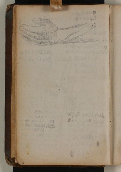 Curator: My first impression is of a frantic energy. Lines dart every which way. It feels unfinished, raw. Editor: Indeed. What we have here is Niels Larsen Stevns' "Kompositionsudkast til Blichers novelle "Bettefanden\", p. 129 - Krushoved opdager Bettefandens besked. Notat", created sometime between 1932 and 1935. The materials include pencil, pastel, and coloured pencil on paper. It's currently held at the SMK, the National Gallery of Denmark. Curator: Stevns... illustrating a Blicher story? The lightness of the sketch style almost clashes with what I know of Blicher's darker, more grounded narratives. There’s a dissonance that intrigues me. The looseness of the line work… it's practically shivering. Editor: The sketch is exactly what the title suggests—a compositional study. Observe how Stevns employs line to map out space, narrative moments and figure placement. There is also what appears to be a block with the text "12 BF," perhaps indicating page twelve of Blicher's "Bettefanden," marking a very precise reference. Curator: Precise yet frantic—a strange duality. It's almost as if he's chasing the story, trying to capture a fleeting emotion before it disappears. It definitely mirrors a kind of inner disquiet. And look, some almost indecipherable handwritten text beneath. Are those notes for staging a scene, maybe? Editor: Perhaps. Or considerations around character. The medium is not only line, though it certainly drives the dynamism, but script as well. Think about how a combination of pastel and pencil yields incredibly textural possibilities to an artist. Curator: Agreed, those deeper shades convey the emotional texture too! This really resonates as more than just an under-drawing, and that makes all the difference. Editor: Precisely. A dynamic glimpse into an artist’s process while engaging a very specific text from Danish history. Curator: And a great jumping-off point to revisit that text too!