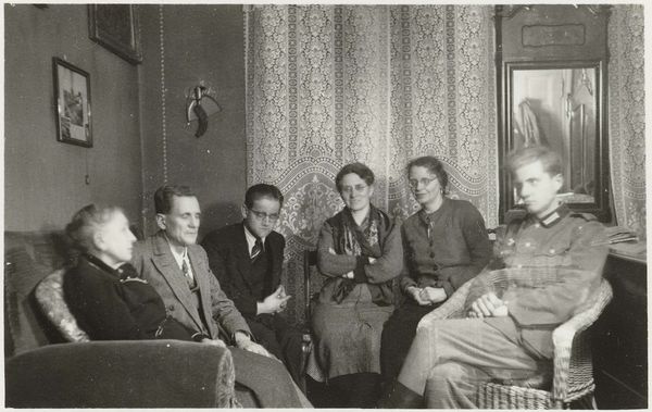 Curator: What strikes me immediately is the formality; a suited and booted crowd in ‘30s garb at a gallery opening—perhaps self-consciously cultured? Editor: Indeed. This is a gelatin silver print from 1938 by Lilly Samuel. It's titled "Bezoekers opening surrealisme-tentoonstelling Galerie Robert, Amsterdam 1938"—or "Visitors at the opening of the Surrealism exhibition at Galerie Robert, Amsterdam, 1938". It's a fascinating artifact of the time, especially given the context of impending war. Curator: The production values speak to the time, the paper, the darkroom techniques… You get a strong sense of the materiality and the labor involved. It's not the throwaway digital image of today. I see craftsmanship. Editor: Absolutely. The photograph provides a glimpse into the institutional setting that fostered Surrealism. It reveals how the gallery played a pivotal role in shaping and disseminating this radical aesthetic to a specific audience, establishing it within the cultural landscape of Amsterdam. Curator: Looking at the fashion gives hints as to how surrealism made its way into design, or whether certain aesthetic tastes already predisposed some to appreciate it. What do we make of this "occasion" dressing? The event has created its own context. Editor: The image also captures the social milieu surrounding Surrealism, offering clues about who engaged with this avant-garde movement and what kind of social and intellectual circles embraced it. Did they understand the movement's ethos, or were they merely partaking in a trend? It's difficult to determine from an image, though interesting to consider. Curator: And what would those opening night conversations sound like, considering the period? Were people aware of the immense shift coming? Did the avant-garde feel a certain obligation or alienation given these tensions? Editor: These are profound questions, all brought to the surface by a seemingly straightforward photograph. It speaks to the power of art and documentation as historical records but also, as prompts for vital discussions that engage across diverse perspectives. Curator: Precisely. Seeing it with fresh eyes also illuminates how tastes are formulated in a place, in a period, in a social milieu, leaving me keen to explore this moment further.