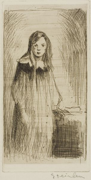Curator: Take a moment here to consider Degas' "The Infanta Margarita, after Velázquez," created between 1856 and 1866. This piece is an etching, a print, residing here with us at The Met. What is your first thought when you see it? Editor: It feels like a ghost of a painting. Light, fragile, like a memory barely there. A far cry from the pomp and circumstance usually attached to royal portraits. Curator: Precisely! That “ghostliness” comes partly from Degas’ printmaking technique but also, I believe, from his intention. Velázquez, of course, was painting the apex of power, while Degas is filtering that through his own, more modern, sensibility. We glimpse not just a princess but childhood itself, vulnerable and perhaps a little lonely. Editor: I see that. It's fascinating how the act of reproduction shifts the symbolic weight. The original Velázquez screams power, every detail reinforcing dynastic strength. Here, all that’s distilled down to a single, fleeting impression. The dark, swirling lines of the dress contrast with her ethereal face. I wonder, is Degas stripping away the layers of representation to find some truth underneath? Curator: Perhaps the “truth” he was after was artistic rather than strictly representational. He returned to this image again and again, experimenting. Copying the old masters was a key part of his process—he almost seems to be in dialogue with Velázquez. And you see hints of his future dancers in the subject's delicate stance, the emphasis on the structure beneath the fabric. Editor: Right, it’s like he’s deconstructing the idea of the royal portrait. The heavy costume becomes almost abstract in his interpretation, and all attention focuses on her face and the question of what her fate will be. Symbols are inverted, in a way. What was once a declaration of lineage becomes an almost unsettling question mark hanging over this girl. Curator: Exactly. The etching gives us a softer edge, and that feels very Degas. It is less a picture of power and more about being observant and sensitive to human fragility, if that makes sense? Editor: It does. A powerful lesson on how images speak and transform across time, always shifting meanings. This seemingly quiet work manages to shout rather loudly about the relationship between past, present and the future, or more precisely, someone else's version of the present. Curator: I find myself pondering Degas' fascination, his artistic engagement. Thank you for reminding us how interpretations shape legacy!