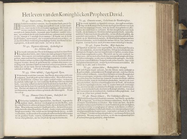 This page from ‘Acht toelichtingen bij voorstellingen over het leven van David’ by Jan Philipsz Schabaelje, made around the mid-17th century, presents a dense field of black letter text, sharply contrasting with the off-white paper. The rigid columns create a structured, almost architectural form, characteristic of early printed books. The initial letters of each section are enlarged and decorated, adding a touch of visual flourish. The artwork invites us to consider how the formal arrangement of text can shape our reading experience. In structuralist terms, the fixed grid of the print acts as a framework through which the narrative is conveyed. The uniformity and repetition of the letterforms establish a systematic order, a 'grammar' of sorts, guiding the reader through the text's content. The inherent contrast between text and negative space is essential here; the interplay highlights a tension between conveying the divine word and the aesthetic possibilities of printed matter. This page exemplifies how meaning is constructed through both textual and visual components.