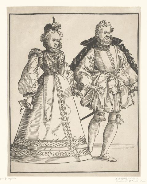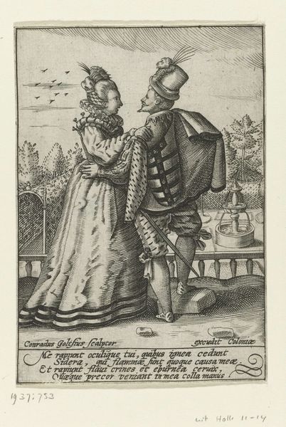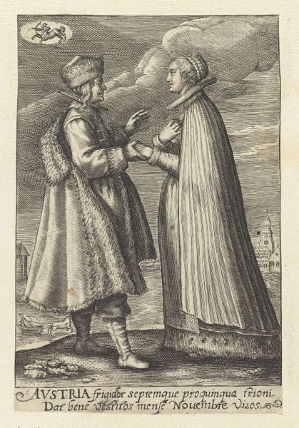 Curator: My first thought is that this scene feels so delicately observed, like a tiny snapshot of a fleeting moment, captured in monochrome. It feels theatrical but deeply intimate. Editor: Indeed. What we have here is "Standing Woman and Man with Snuffbox," an engraving that likely dates from sometime between 1683 and 1733 and it is by Bernard Picart. It’s currently housed here at the Rijksmuseum. It is such a curious piece. What do you suppose might be its purpose or aim? Curator: Well, for me, the narrative seems fairly clear. I’m immediately drawn to the way the woman offers the snuffbox; it’s as if she's sharing a secret, perhaps a slightly naughty indulgence. And that ridiculously cascading wig… the artist really understood the drama of the era. He must have really reveled in capturing that! Editor: Absolutely. That wig is certainly a statement, a symbol of status and access and thus perhaps what the whole scene is meant to comment on. Beyond the individual narrative you are drawn to, consider this through the lens of its time. The piece serves as a glimpse into the social rituals of the upper classes; the careful dress, the formalized offering. Curator: Do you think he critiques their superficiality? The over-the-top fashions of that moment, now rendered in elegant lines, they make me wonder if the artist is not necessarily criticizing it all but observing the theatrics with fondness and also not so fondness. Editor: Perhaps both! But, I do also find it equally as important to see the socio-economic circumstances, and it is clear from pieces like these that rigid social hierarchies governed interactions, that objects became imbued with social meaning. The act of sharing snuff becomes performative rather than simply habitual. This simple exchange highlights power and decorum. Curator: Absolutely, and even then, for me, I still wonder what would it have felt to make this or witness it… like pressing pause on a minuet and being able to observe that split-second with playful intent. What would that feel like! I just have this sense that it came out from a real person living in that moment with desires, habits and emotions just like us. That part I do not want to erase, while knowing about all the historic, institutional elements. Editor: A beautiful sentiment! Indeed, connecting emotionally with art across time provides much needed context and richness. This print lets us peer through a crack in time, doesn’t it?