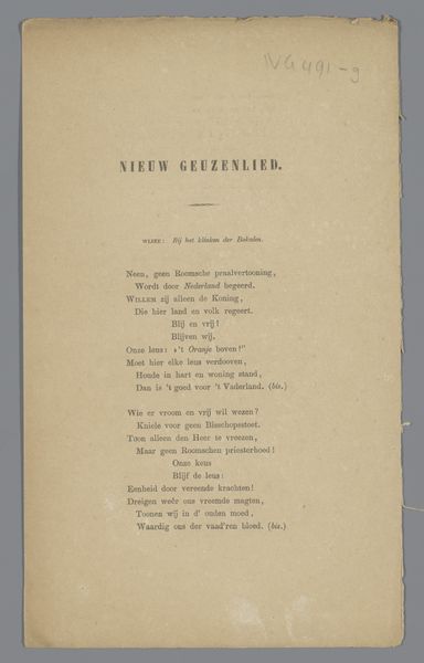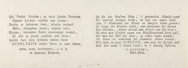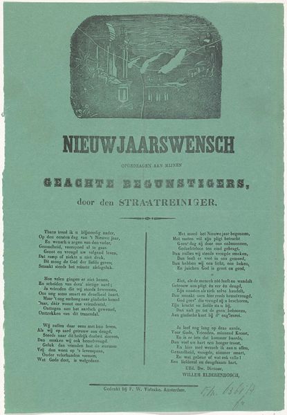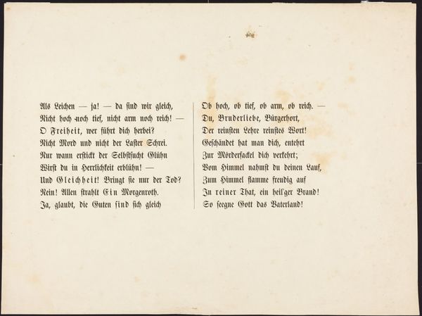 Curator: We're looking at "Spekulationskærlighed - Ægtestand," which translates roughly to "Speculative Love - Matrimony." It’s a print, done in 1819 by Gerhard Ludvig Lahde. Editor: Oh, this is darkly funny! Just the typography itself, with its sharp lettering, sets a cynical tone. Are we sure it’s about love and marriage? It feels more like…a business transaction gone sour. Curator: Precisely! It critiques the social context of marriage, exploring how economic interests often trump genuine affection. Look at the composition: on one side, “Speculative Love,” on the other, “Matrimony”. Editor: It reads like a dialogue, doesn’t it? "He" promises the woman things and then she talks about the ranks that she gets. It really sounds mercenary in some parts, particularly in its focus on financial matters! Almost sounds like a very weird contract with two sides in this marriage Curator: It’s broken into separate sections, each expressing different viewpoints – the man, the woman, and the collective "both," finally, "Parterret", which kind of stands back and analyses the drama unfolding. Lahde challenges romanticism by portraying a less-than-ideal relationship, influenced by material concerns. Editor: Right. And notice how it doesn’t shy away from the uglier aspects? Like in that verse for “Parterret" – "She bickers and bites… now, she scratches him!" Hardly the fairytale image we associate with marriage. It's interesting too when reading the end that they are next to each other in trouble and conflict, Curator: It’s a commentary on societal expectations and the pressures placed on individuals within the institution of marriage. The very materiality of the print—paper, ink, typography—facilitates this spread of critical social commentary through mass production. Editor: Makes you think about the actual labor that went into producing this piece, too, huh? The engraver's craft meticulously laying out these pointed little verses. Makes me think how little the expectations have actually changed in the following centuries. Curator: It certainly gives us a lot to ponder about enduring attitudes toward love and matrimony. Editor: Indeed, and how art captures and refracts these complex social dynamics!