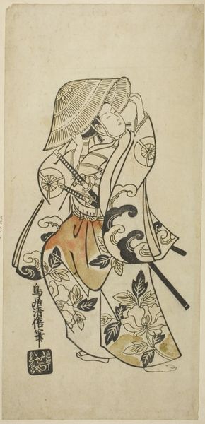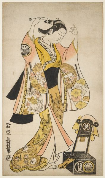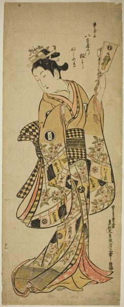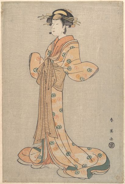Okumura Toshinobu created this woodblock print, depicting the actor Arashi Wakano in a female role, in 18th century Japan. Here, the Kabuki actor's performance blurs the line between male and female identities. This speaks to the flexible social norms of Japan’s urban centers, where Kabuki flourished. The art of Kabuki had close ties with the floating world of pleasure districts and teahouses. The censorship of the Tokugawa Shogunate banned female performers in 1629, but that didn’t stop women from frequenting the theatre. Female impersonators like Arashi Wakano, became celebrities, their likeness reproduced for mass consumption in woodblock prints such as this. Understanding this print means exploring the social function of Kabuki in the Edo period, and the ways in which the theatre became a space for both social commentary and cultural production. Researching the history of Kabuki theatre, the biography of Arashi Wakano, and the censorship policies of the Tokugawa Shogunate would all contribute to a deeper understanding of this print.