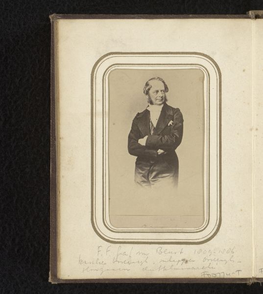 Editor: Here we have a gelatin silver print, *Portret van een man met baard,* or *Portrait of a Man with Beard*, made sometime between 1855 and 1880, by Witz et Cie. The man is striking a confident pose. How do you interpret this portrait within the social context of its time? Curator: Well, it's fascinating to consider how photography like this contributed to the construction of identity in the 19th century. It served not only as a document, but also as a declaration of self. Given the prevalence of photographic portraits within the Romantic movement, this portrait invites us to consider issues of class, gender, and power dynamics that are inherent in visual representation. How does his gaze strike you? Editor: He seems very self-assured, maybe even a bit defiant. Like he is presenting a particular image of himself to the viewer, to society. Do you think the trappings of wealth are performative here? Curator: Precisely. Photography, particularly portraiture, becomes a stage for enacting social roles. His stance, the neatly groomed beard, the clothes, they all contribute to a narrative that affirms certain bourgeois ideals. It’s worth questioning whose stories get told and amplified through this medium. Also, what social strata and genders are largely missing or misrepresented? Editor: That's an interesting way to frame it; it makes me consider the role of the artist. Are they complicit in this social theater or are they also commenting on it? Curator: That's the crucial question. Analyzing the photographer's choices, like the framing, lighting, and backdrop, can give us hints about their perspective. Examining such pieces allows us to critically analyze the power dynamics that permeate both art and society. What is left out or is purposely highlighted to shape identity? Editor: I had not considered portraiture this way. It makes you wonder whose image gets immortalized, and what that says about cultural priorities then, and now.