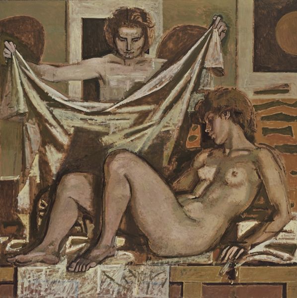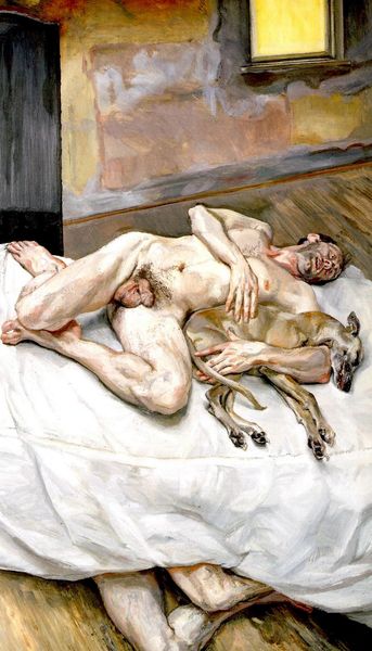 Lucian Freud made this unsettling painting with oil paint on canvas. The figures are not idealized, and that is where the painting's power lies. The paint is applied with a brutal, almost sculptural quality, particularly in the rendering of the flesh. Look at the area around the male figure's arm, how the paint seems piled on, creating texture and depth, each stroke a deliberate mark. The color palette is subdued and earthy, emphasizing the raw, unvarnished nature of the scene. It’s like he's revealing something very private, but also very human. The composition is both intimate and confrontational, echoing work by artists like Paula Rego. Freud does not shy away from the awkwardness and vulnerability of the human form. It’s a painting that lingers in your mind, inviting multiple interpretations and challenging our notions of beauty and desire.