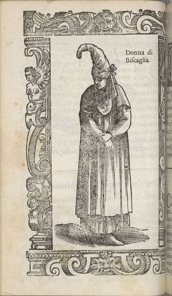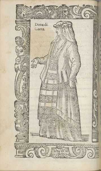 Christoph Krieger’s “Lituana di condiotone” presents us with an intriguing study in contrasts and framing, rendered in a monochrome palette of sharply defined lines. The subject is a Lithuanian woman whose garb is elaborately detailed with geometric patterns and textures, immediately drawing the eye. Her figure is centered, almost floating, in a space defined by ornate architectural borders. The use of heavy lines creates stark divisions between figure and setting, emphasizing the subject’s presence while paradoxically isolating her within the frame. The classical motifs in the border, such as the grotesque masks and vegetal volutes, create a tension with the Lithuanian subject, hinting at broader themes of cultural representation and the gaze. We can read it as an early instance of ethnographic depiction, where the formal qualities—the lines, the framing—become crucial in understanding how different cultures are viewed and presented. Consider how the composition and the stylistic choices serve to highlight the act of observation itself, prompting questions about cultural exchange and artistic interpretation.