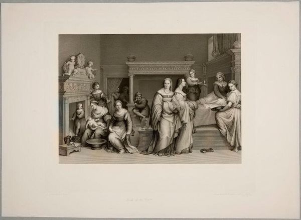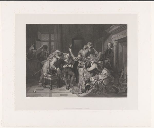 Curator: Achille Louis Martinet gives us "Charles the First (In The Guardroom of Cromwell's Soldiers)," a scene thick with tension. Immediately, I’m struck by the claustrophobia, the feeling of being cornered. Editor: The composition itself speaks volumes, doesn't it? The contrast between Charles, seated and seemingly composed, and the boisterous soldiers…it’s a potent visual statement. I can almost hear the clatter of their gear. Curator: It's that very contrast which captivates me. The weight of history, you know? Charles, a king stripped of his power, yet retaining a fragile dignity amidst the revolutionary fervor. You can almost feel his quiet defiance radiating outwards. Editor: Indeed. And let's not overlook the material implications. Martinet, working likely from an earlier painting, reproduces the scene through engraving. This process democratizes access, transforming a royal drama into a consumable print for the masses. Curator: I always thought this image revealed the profound human drama underlying those shifts in power, regardless of class—an intimate portrayal of fallen majesty. Editor: Perhaps. But, it's also a manufactured image intended for consumption. The very act of its making and distribution has political and social implications, reshaping the narrative of the English Civil War. Curator: Ah, well, it's fascinating how one picture can hold such different worlds. It’s not just history, it's also a lens through which we view our own world. Editor: Precisely. And the means by which that lens was constructed matters as much as the image it projects.
