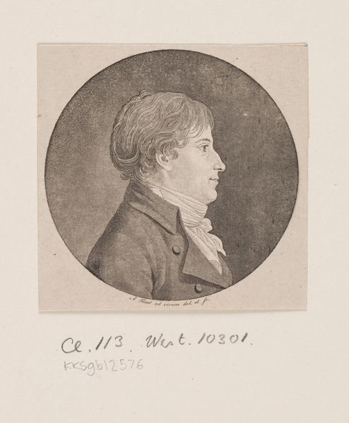 Andreas Flint created this portrait of J. F. Prehn through engraving, a process of carving into a plate, in the late 18th or early 19th century. At this time, Europe was still in the throes of aristocratic power structures, visible here in the high-necked shirt and tailored jacket of the sitter. What does it mean to capture a likeness, and who is deemed worthy of such representation? This image reflects a very specific class, gender, and probably race. The detail and care taken in rendering Prehn's features suggest an elevated status. The soft lighting creates an intimacy, while the circular frame evokes the tradition of portrait medallions celebrating important figures. Flint positions Prehn as an individual of note. As you gaze at this image, consider who is missing from these historical records. Whose stories remain untold, unseen in the halls of museums? Art can serve as a mirror reflecting societal values, but also as a window into alternative narratives.