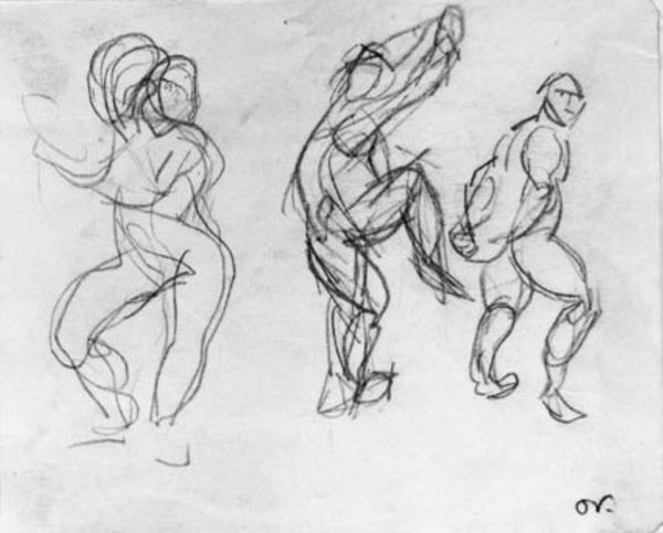 This sketch, "To studier af arbejdende mænd" by Othon Friesz, presents us with two figures rendered in swift, confident strokes of ink on paper. The composition, though minimal, pulses with energy, capturing the essence of labor through dynamic lines and forms. Friesz masterfully uses line to define shape and movement. Notice how the hatching creates volume and the density of the marks suggesting musculature and strain. The figure on the left, reaching upwards, is constructed with an economy of line that speaks volumes about the body’s tension and exertion. The opposing figure, hunched and in motion, provides a counterpoint, a study in weight and momentum. This work exists within a lineage of modernist explorations into form and function. Friesz reduces the figures to their most essential gestures, embodying the spirit of early 20th-century investigations into the relationship between art, labor, and representation. It is a work that acknowledges the physical realities of work, while simultaneously abstracting them into a study of pure form.