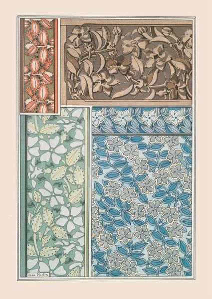 This print titled, "Méduses et algues, vitrail. Cigales et lis, paons et cytise, bordures." was created by Maurice Pillard Verneuil. It features different motifs, including jellyfish, peacocks, and lilies arranged in a decorative panel-like composition. The print is dominated by curvilinear forms and a subdued colour palette, evoking a sense of serene elegance typical of the Art Nouveau movement. Verneuil masterfully uses symmetry and repetition, creating a rhythmic visual experience. The jellyfish, rendered in flowing lines and soft hues, contrast with the more structured arrangements of flowers and insects. The peacock panel, with its cascading wisteria, embodies Art Nouveau’s fascination with nature and Japanese design. Verneuil’s use of stylization is evident in how he transforms natural forms into ornamental patterns, effectively blurring the boundaries between art and decoration. Note the deliberate structure in each section. This work is not just aesthetically pleasing; it represents a broader cultural interest in harmonizing art with everyday life. The print destabilizes the traditional hierarchy between fine art and design, inviting us to reconsider the value and function of ornamentation in modern society.
