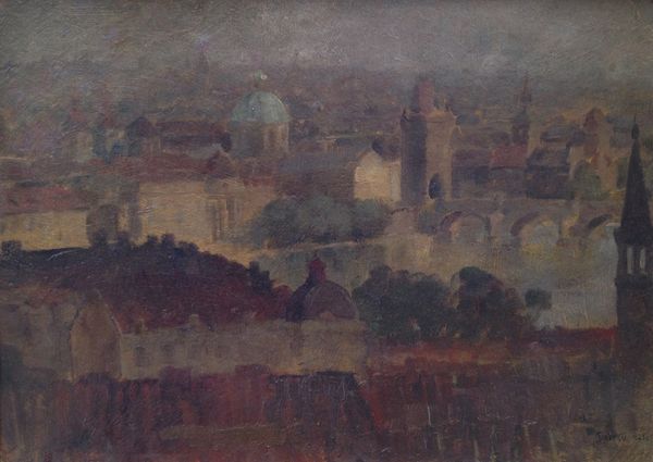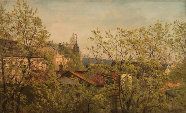 Editor: Here we have Jan Matejko’s “View from the Town Hall Tower,” painted in 1857, using oil paints. The warm tones and perspective give me a sense of being enveloped by the city. What stands out to you? Curator: Notice how the composition directs our gaze. The artist uses the architectural lines, primarily the rooftops and facades, to draw the eye upwards to the towers and the sky. The interplay of light and shadow creates depth, yet observe how the details soften into atmospheric perspective in the distance. How does the materiality of oil paint contribute to this effect? Editor: I see that the layering creates a sense of texture, especially in the rendering of the brickwork, but also, conversely, contributes to the hazy background... So you're seeing the oil paint as intrinsic to this overall formal structure, this perspective and depth? Curator: Precisely. Consider the formal relations between the colours themselves. The dominance of the red-brown hue unifies the cityscape, contrasted only by the band of blue. Ask yourself: what impact does this limited palette have on the overall structure and mood? How might a different choice of colors alter your perception? Editor: I suppose it streamlines everything. It does create a harmonious feeling but maybe somewhat static? This deep dive has really clarified how formal elements shape our interpretation. Curator: Indeed. Analyzing structure allows us to appreciate the choices an artist makes in shaping visual experience. Every brushstroke contributes.
