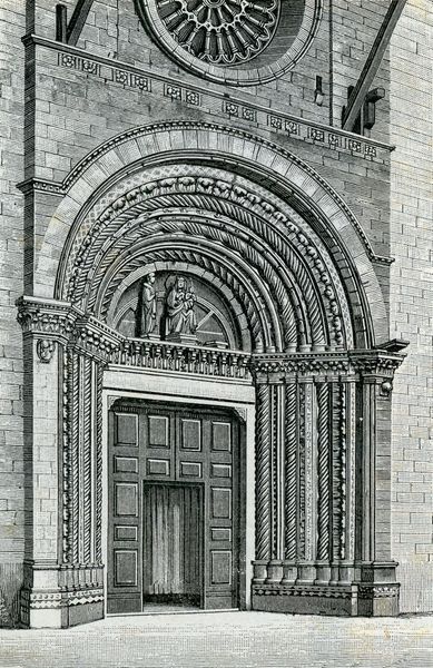 Curator: Oh, my. This has such a powerfully serene feeling about it. Editor: Indeed. What you're looking at is entitled, "Lunetta Della Porta Maggiore," an engraving created around 1900 by Giuseppe Barberis, depicting, naturally, a lunette over the Porta Maggiore. Curator: The architectural rendering gives the image a very firm, formal presence, of course, but I think that's offset so cleverly by the softness and grace infused into the sculptural elements. It reminds me a little of that old saying: "Iron fist, velvet glove." Editor: The symbols here, though understated, resonate deeply. Note the three figures elevated within the lunette—a grouping quite pregnant with historical echoes. At center, it looks as though it could be the Madonna and Child. Flanking them are what seem to be saintly or prophetic figures, anchoring the composition in sacred narrative traditions. Curator: They provide an interesting focal point. Each statue looks like it’s caught in a private moment of reflection. It’s a lovely contrast to the stoicism of the stone facade that encloses them. It makes one wonder about the weight of history, and the narratives people built to get them through the passing of time. Editor: You are quite right; notice the delicate balance the artist has struck, embedding universal yearnings within stone. It really does compel reflection. If anything, this engraving stands as an ode to continuity, seamlessly bridging eras through enduring images and forms. Curator: I think so. It gives me shivers, realizing just how potent images are, still, after all this time. I’ll never look at historical buildings the same way again.