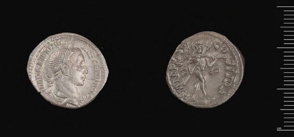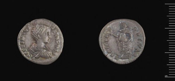 Curator: This is a Denarius of Mn. Acilius, likely crafted in Rome. Its maker was the moneyer Mn. Acilius. Editor: The severe profile and pitted surface give it a stoic, almost weathered, presence. The texture is quite compelling. Curator: The obverse displays Salus, the Roman goddess of safety and well-being, suggesting a hope for prosperity and health. Editor: And on the reverse, we see Valetudo, mirroring Salus, further reinforcing the symbolic connection between these deities and the coin’s purpose. Curator: The die work, though worn, reveals a controlled composition, emphasizing the clean lines of the portrait and figure. Editor: It does spark curiosity about the cultural values placed on security and welfare during that era; a tangible link. Curator: Indeed, this coin serves as both an aesthetic object and a poignant artifact of Roman hopes and anxieties. Editor: Its compact form holds so much historical and emotional resonance; it's quite moving.