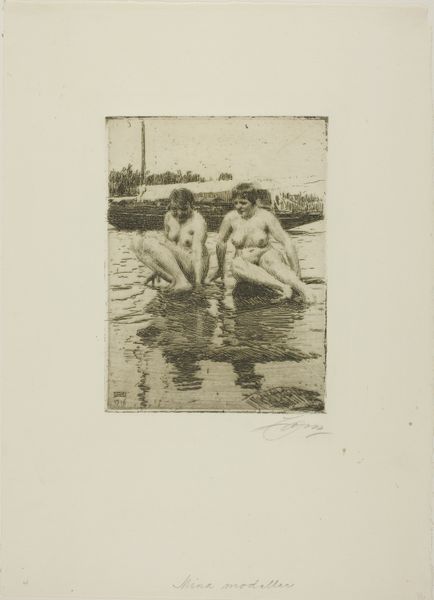 Editor: This is Anders Zorn's "Water-Nymphs," an etching on paper from 1918. It depicts two nude women in water, with a blurry landscape in the background. The composition feels both classical and intimate, almost like a stolen moment. How would you interpret this work? Curator: I'm immediately drawn to the material process. Look at the density of the lines in the etching, the labor involved in creating that sense of light and shadow. How does the *act* of etching – the physical work on the copper plate, the inking, the printing – inform the representation of these idealized female figures? Consider, too, who Zorn was producing these for, and how that consumption reinforces a certain societal gaze. Editor: So, beyond the idyllic scene, you see commentary on the act of creation itself, and how that creation fits into broader societal structures? Curator: Precisely. Think about the tradition Zorn is engaging with, the long history of nudes in art. How does he, through the *means* of printmaking, democratize or perhaps even commodify this imagery? What kind of labor, skill, and training was needed? What makes this *high art* versus another sort of illustration in a magazine? Editor: That's fascinating! I was focused on the subject, but I didn't really consider the implications of it being a print. So it’s not just about what's depicted, but the materials, processes, and systems of production that create the art, which has social context? Curator: Exactly! The layering of meaning doesn’t just exist in the figures; it resides in every line, every choice of medium, every impression pulled from the plate, and its place and purpose within societal contexts. Editor: I hadn't considered art-making in that much depth before. Now, when I look at the print, I think about the whole story of its manufacture and place in society. Curator: And that, perhaps, is the richest way to experience it.