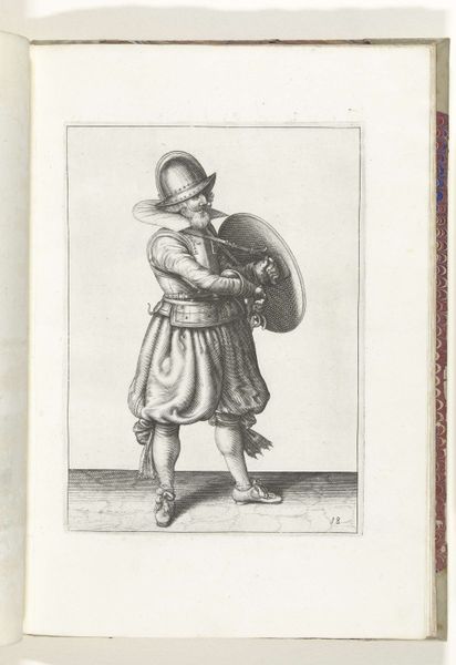 Adam van Breen created this etching in 1618 depicting a soldier's exercise with shield and spear. It’s a moment frozen in time from the early 17th century when the Dutch Republic was asserting itself on the world stage. The image is more than just a demonstration of military drills; it speaks to a society in transition. The soldier, clad in armor, is caught between tradition and modernity, reflecting the changing nature of warfare and societal roles. Who was allowed to bear arms? Who was conscripted? And what did military service mean for one's identity? The print emphasizes precision, control, and discipline, yet the soldier is rendered as an individual, complete with a rather dashing mustache. This artwork is a study in masculinity and duty during a period of intense political and social change, encapsulating a moment where personal identity intersects with collective ambition.