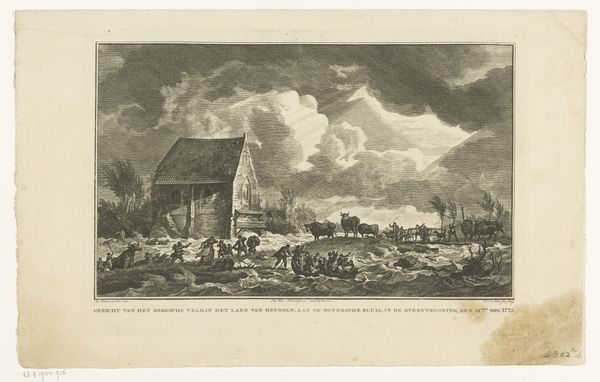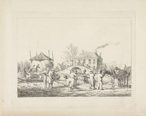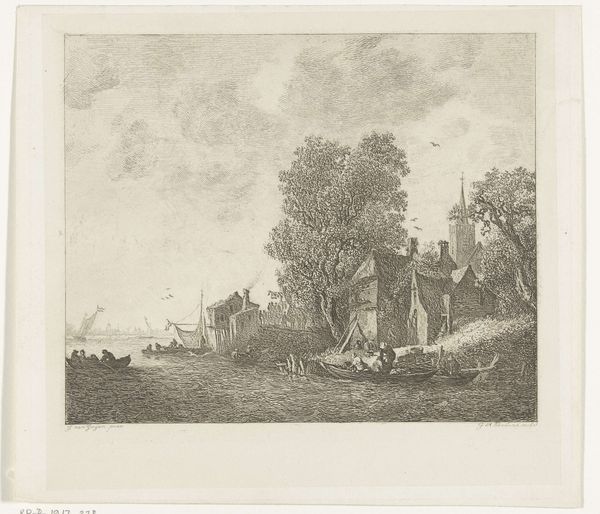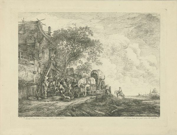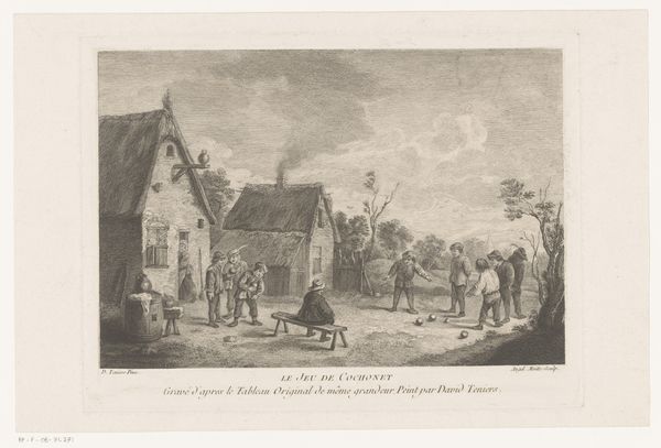 Jean Moyreau created this print, "Ringsteken bij een dorpsherberg", using etching techniques. The composition is dominated by horizontal lines, from the river in the foreground to the clouds above, with the figures and the ring adding vertical interruptions. Moyreau masterfully uses the limited tonal range of etching to create depth. The lines of the building on the left, the figures scattered throughout, and the texture of the landscape are all meticulously rendered. Note the contrast between the detailed foreground and the subtly fading background; this visual hierarchy guides our eyes, creating a sense of recession and expansive space. The use of line is more than descriptive; it’s expressive. The marks define form and texture, engaging with contemporary ideas about pictorial space and representation. It invites us to reflect on how meaning is constructed through visual language. Consider the dynamic interplay between light and shadow, achieved through the strategic placement of lines. It captures a sense of movement and depth, drawing us into its world.