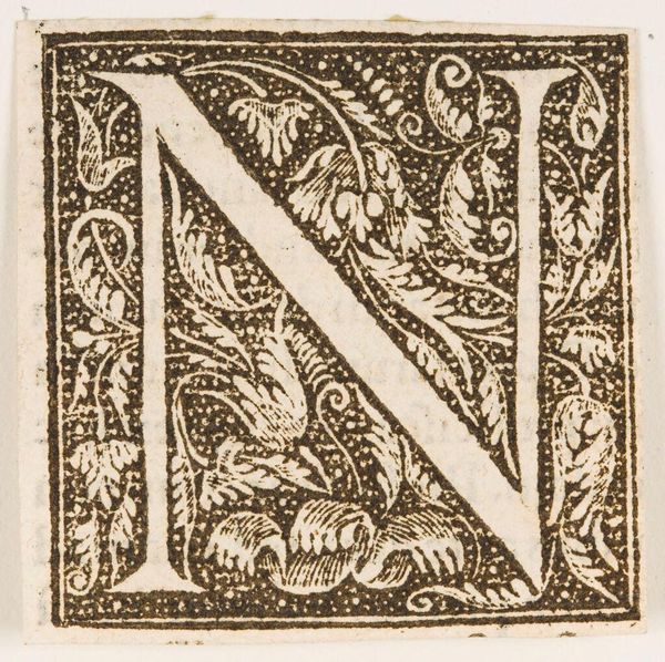 Curator: Looking at this piece, attributed to an anonymous hand, I'm immediately struck by its graphic power. It’s just the letter M, but feels like a portal. Editor: It definitely has a striking quality. For me, the density of the letterform and the organic motifs surrounding it speak to the interconnectedness of language and nature, a relationship often erased in our modern understanding. Curator: Yes, it's as if the letter is growing from the page! I find myself wanting to know the hand that carved it, the words it might have begun. It feels like a fragment of a forgotten story. Editor: Absolutely. And that anonymity is telling, isn't it? It reminds us to consider whose voices and artistic contributions have been historically excluded from recognition, their stories untold. Curator: A lovely, poignant little reminder, isn't it? A single letter holding so much history and possibility. Editor: Precisely. It's a testament to the power of the overlooked.