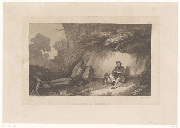 Editor: This lithograph, "Italian Mother with her Two Children," created in 1859, presents a tranquil scene, almost like a memory. The rendering has this soft, hazy quality. What stands out to you most about the symbolism in this piece? Curator: What strikes me is how the composition seems to divide life stages. The sleeping infant in the cradle, the girl spinning – a potent symbol of fate and feminine virtue – and the adult woman carrying goods, burdened by her labor. Can you see how the landscape itself reinforces this idea of a life journey? Editor: I see it! The light in the background, where the woman stands, feels much brighter than the shadowed area where the children are. Like the path forward is illuminated. Curator: Precisely. And consider the contrast between the solidity of the rocks and the delicate act of spinning. One represents endurance, the other, transience. Think of how spinning appears in folklore, tying women to both creation and destiny. The artist here uses that potent symbol. Editor: So it’s not just a simple scene of motherhood; it is invoking cultural memory? It makes me wonder what the artist wanted the viewer to think about. Curator: That is the crucial question, isn't it? Consider the romanticized vision of Italian peasantry popular at the time. Were these simply exotic subjects, or something more profound? Editor: I hadn’t considered the exoticism of it at all. I just took it at face value: a sweet domestic scene. Curator: It's tempting, I agree. But peeling back the layers of how a culture perceives another reveals volumes about itself. These images are never neutral carriers of an innocuous past; instead, their visual encoding projects very powerful messages. I leave it to you to figure out what that could be, based on all our discussion! Editor: This really has opened up a new way to look at how everyday scenes become imbued with much more.