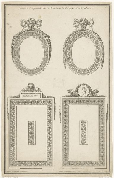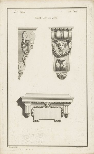 Editor: This is "Console met bladmotieven en medaillon," or Console with Leaf Motifs and Medallion, an engraving dating from the late 18th century. It features these very precise, almost technical drawings of Baroque architectural elements. It feels quite formal, like a blueprint of sorts, and makes me think of interior design. What strikes you when you look at it? Curator: The most immediate aspect to me is the document's intended function within 18th-century French society. This print served a clear pedagogical purpose: the dissemination of design ideas. Remember, this was a pre-photography era; engravings like these were critical for circulating aesthetic concepts amongst craftsmen and patrons alike. Editor: So it's not really art for art's sake? Curator: Precisely. Its aesthetic value is entwined with its social role. Consider how the rigid lines and symmetrical forms echo the Baroque aesthetic embraced by the French aristocracy. They used decorative arts to project power and status, both politically and culturally. Did objects like these reinforce existing hierarchies? Editor: I hadn't considered the power dynamics inherent in something that seems so…ornamental. So, these designs weren't just about beauty. Curator: Exactly. Think about the artisans who would have translated these designs into physical objects. The print normalizes specific aesthetics, it dictates design principles. Therefore, it controls aspects of cultural production itself. The printing houses themselves had considerable influence at this time, both in controlling output but also feeding demand for the design trends. Editor: I guess it highlights how something seemingly simple can be embedded with political and social implications. I’ll never look at an engraving the same way again!