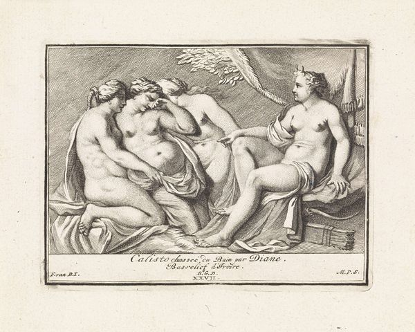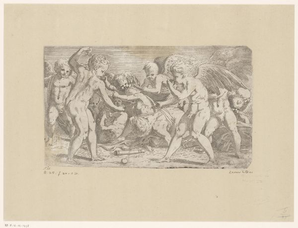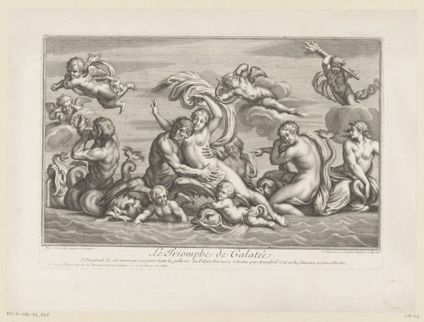 Curator: Welcome. We are looking at Matthijs Pool’s 1727 engraving, “Bas-relief met triomftocht van Bacchus” or “Bas-relief with the Triumph of Bacchus,” currently residing in the Rijksmuseum collection. Editor: It feels almost claustrophobic, doesn’t it? So much texture crammed into a small space. Look at how densely packed the figures are—pure Baroque exuberance fighting against the confines of the frame. Curator: Absolutely. It's steeped in Baroque allegory and mythology. Bacchus, of course, is the Roman god of wine, fertility, theatre, and religious ecstasy. Notice the putti and satyrs surrounding him, key figures in his retinue, contributing to an overall atmosphere of joyful abandon. Editor: The engraving’s textures create interesting contrasts; the smooth skin of Bacchus juxtaposed with the fur of the satyr, or the rough hide of the donkey. And there's this interplay of light and shadow. Although the composition appears dynamic, I can't help but feel this effect limits visual clarity. Curator: Precisely, and observe the careful rendering of Bacchus himself. Although appearing celebratory and jovial, nude figures, historically, signify a kind of divine status. Editor: How do you mean? Curator: Well, from antiquity to even now, in some corners, nude figures can sometimes communicate purity or innocence. But given Bacchus' character, there’s an irony and contradiction in those meanings, adding to the richness of the image. Editor: So it's not merely about glorifying the god's earthly pleasures, but also hinting at deeper philosophical themes? Curator: Precisely! His triumph becomes a representation of life's vitality and abundance, a kind of cyclical renewal of the world's forces, and is about more than just intoxication and revelry. Editor: I appreciate seeing it this way—more than just the exuberance that hits you at first glance, now, there's something really quite nuanced that also emanates from this engraving. Curator: I agree, taking the time to observe its motifs rewards us with a much more layered appreciation.
