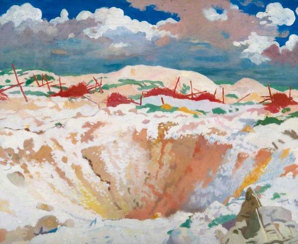 Curator: Boris Kustodiev painted "Hard Rime" in 1917, a landscape rendered in oil paint that captures the stillness and weight of winter. Editor: It feels heavy, almost suffocatingly so. The trees are burdened by the snow, and even the colors, predominantly blues and whites, add to that sense of being weighed down. Curator: Considering the period, that weight might extend beyond the purely visual. Kustodiev painted this during a tumultuous year in Russia's history, marked by social and political upheaval with the ongoing war and revolution looming. We have to think about how this artist, with firm roots in the avant-garde, would have been thinking through class tensions and societal shifts while approaching the canvas. Editor: Absolutely. You can see that tension reflected in the brushstrokes, quite thick and expressive, almost violently applied in places. And the figures, barely discernible, feel almost trapped within the landscape, dwarfed by the materiality of snow and ice. It's about more than just depicting winter, it's capturing a specific moment of societal and economic disquietude. Curator: The material reality of that landscape then becomes intertwined with the political realities. Consider the perspective as well. We're looking down, almost observing these figures from above as they traverse through that brutal winter scene. It really creates this stark sense of looking down, rather than within the space, further highlighting this disparity, both aesthetically and physically. Editor: Precisely! I mean, think about where he sourced his materials—pigments, canvas, brushes. Who produced those materials? What were their working conditions? Even those choices and the physical labor involved are part of the story. Even today, when we look at this artwork, we cannot help but acknowledge and realize this context. Curator: By looking at not just the formal aspects, but the socio-political background, the Russian winter transforms from a mere scene into a powerful visual metaphor. Editor: Yes, Kustodiev’s “Hard Rime” is more than a beautiful painting; it's a layered commentary on a society in flux, rendered with palpable weight and tangible brushstrokes.