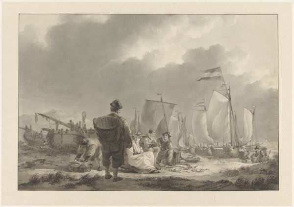 Jean Baptiste Pierre Michiels created this print of Antwerp dockworkers. The scene recalls a moment of industrial ambition under Napoleon I in 1804. The print encapsulates a sense of labor and collective effort, but let's consider it through a contemporary lens. We are invited to reflect on the identities and histories of those involved in its creation and reception. The image offers an opportunity to examine the narratives surrounding work, power, and identity in the 19th century. The workers are presented as a unified mass, their individuality subsumed by their collective labor. The print invites a reflection on the human cost of grand ambitions and the complex interplay between individual lives and historical forces. How do we reconcile the artistic celebration of progress with the realities of labor exploitation? The emotional impact of this piece lies in its ability to provoke questions and challenge assumptions.