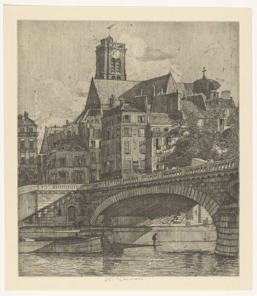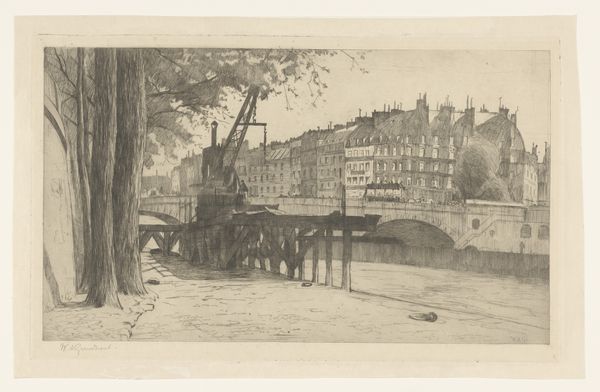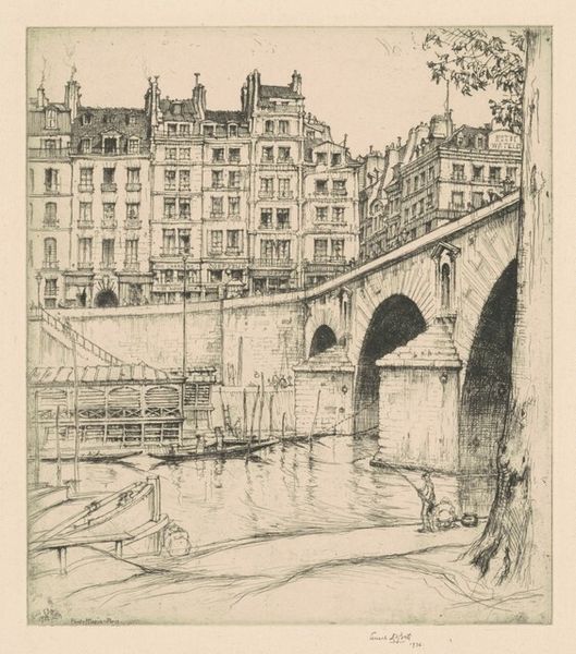 "Le Pont Neuf, Paris," was made by Donald Shaw MacLaughlan, though I don’t know exactly when. It's an etching, so already we're thinking about process, because you have to make a plate before you even make the picture, a kind of double vision. Look at the hatching! It's so dense, so deliberate, creating these rich, almost velvety dark areas. But then there are also these bare, untouched spaces of paper, which make it feel open and light. Notice the contrast between the solid stone of the bridge and the reflections in the water? Those lines aren't just describing things, they're creating a mood, a sense of place. I find myself thinking of Piranesi, but without all that theatrical drama. And then there's that little sketch, the "remarque," at the bottom. It's like a little secret, a bonus image for those who really look. McLaughlan invites you to see Paris not as a grand monument, but as a lived-in, working city. It's a really conversational kind of image making, isn’t it?